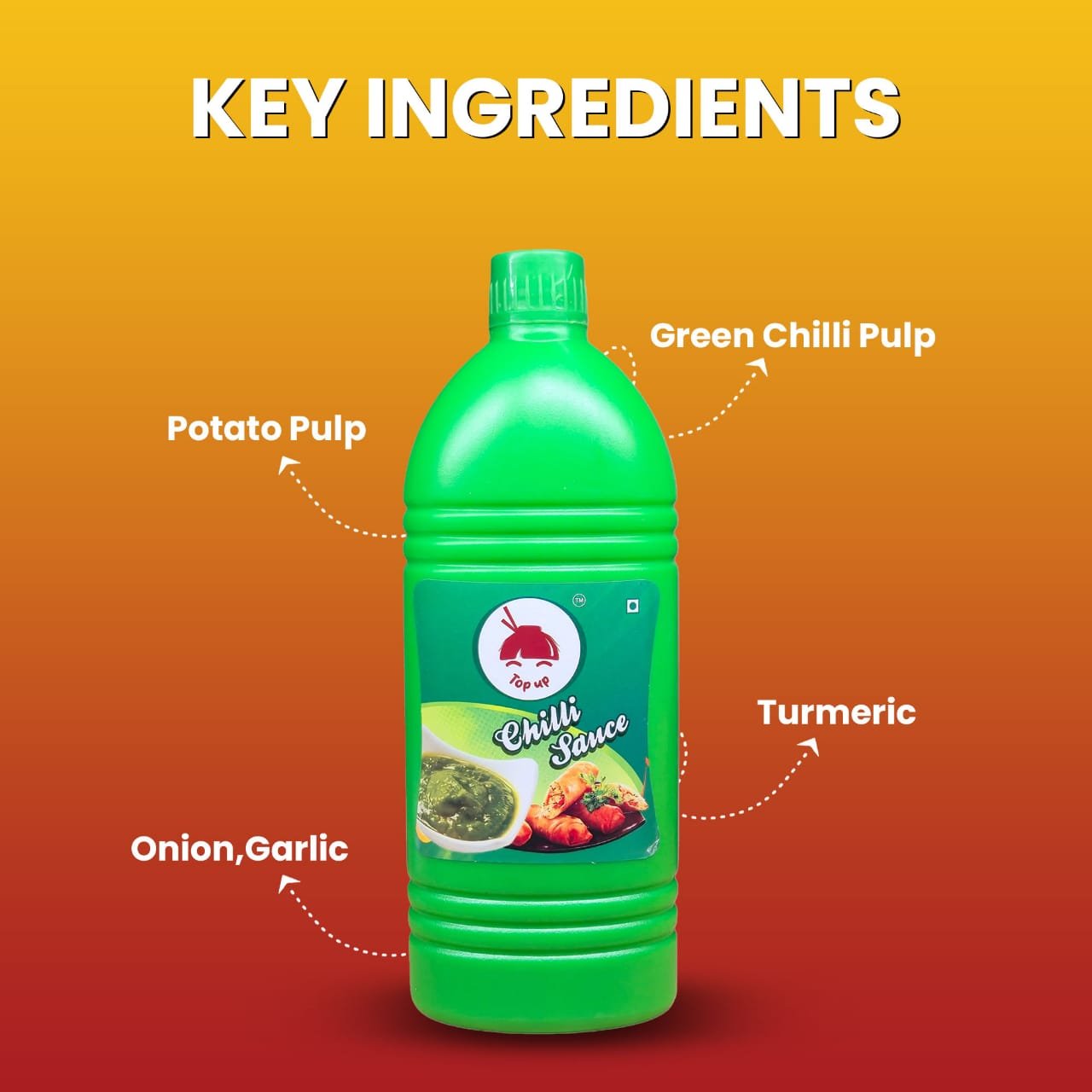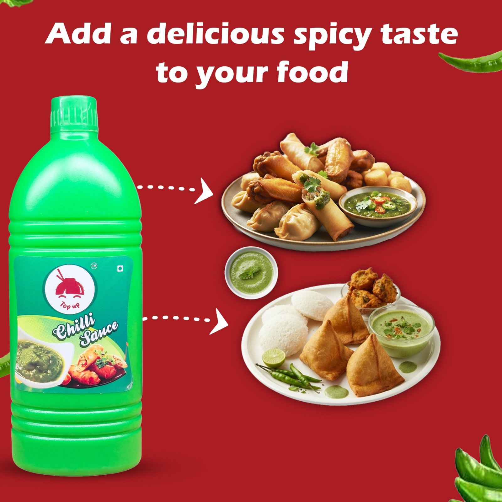 Top Up Chilli Sauce is packed with robust, fiery flavor from handpicked green chilies and select spices. Its unique blend offers just the right balance of heat and tang for samosas, spring rolls, chaats, noodles, and more. With no artificial colors or preservatives, this sauce brings street-food taste to your home kitchen. Great for restaurants, cafés, and busy households, the convenient large bottle ensures you never run out of your favorite condiment.